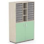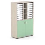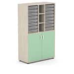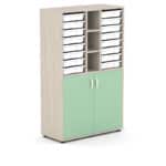 - Armario escolar altura 112 cm, serie Esak con puertas bajas combinando 2 laterales con 8 gavetas pequeñas (o 2 gavetas grandes) cada uno, interior con 2 estantes regulables en altura.