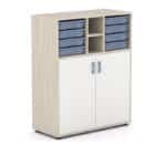 - Armario escolar altura 112 cm, serie Esak con puertas bajas combinando 2 laterales con 4 gavetas pequeñas (o 2 gavetas grandes) cada uno, interior con 1 estante regulables en altura.
