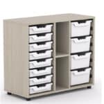 - Gavetero escolar altura 76 cm serie Esak , combinando 2 laterales con 8 gavetas pequeñas (o 4 gavetas grandes) cada uno, y el centro con 1 estante regulable en altura.