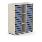 GAVETERO ESAK 24 GAVETAS Y 2 ESTANTES ALTURA 112, se complementa con otros modelos de armarios escolares, la cual tiene una amplia gama de mesas y pupitre colaborativos con diferentes formas y colores.