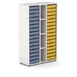 GAVETERO ESAK 32 GAVETAS Y 3 ESTANTES ALTURA 147, se complementa con otros modelos de armarios escolares, la cual tiene una amplia gama de mesas y pupitre colaborativos con diferentes formas y colores.