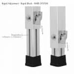 - La altura de las patas se fija mediante un doble cierre de seguridad; con el pomo de presión metálico se ajusta y se fija la altura deseada y como medida adicional de seguridad, las patas se bloquean mediante tuerca de M10, asegurando de esta manera una fijación total de la altura de las patas.