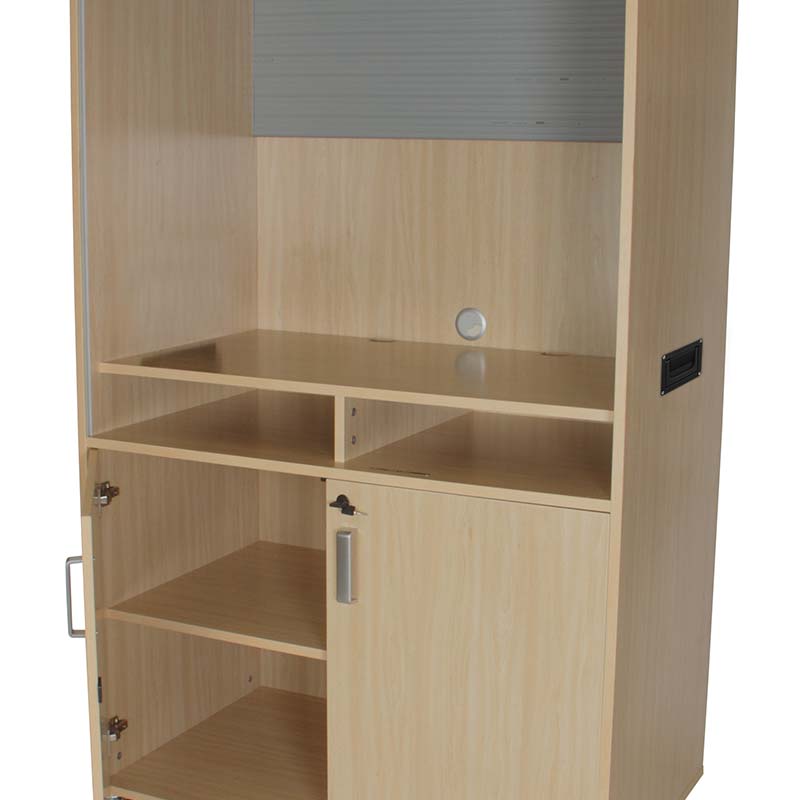 Mueble alto de televisión y vídeo con persiana plástica deslizante de color gris metalizado que posibilita un total ángulo de visión. Provisto de pasacables en trasera y tiradores plásticos plegables encastrados en ambos costados, para facilitar su desplazamiento. Su interior está diseñado para albergar los equipos de televisión y vídeo-DVD.