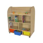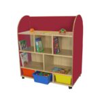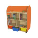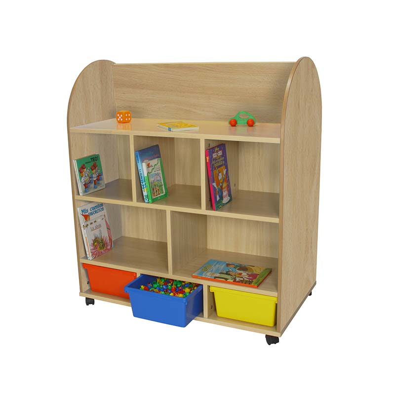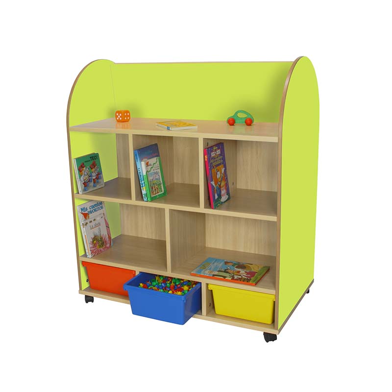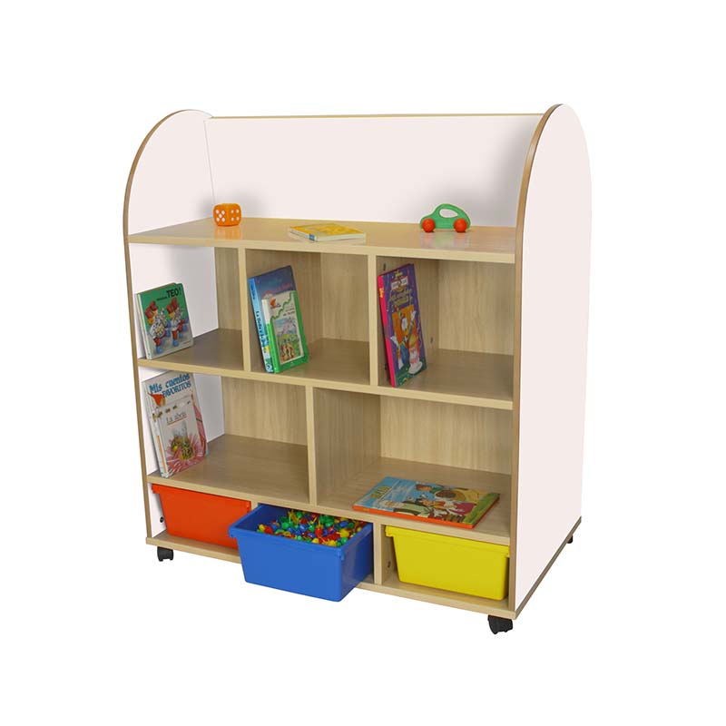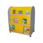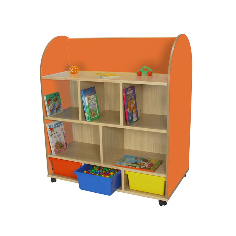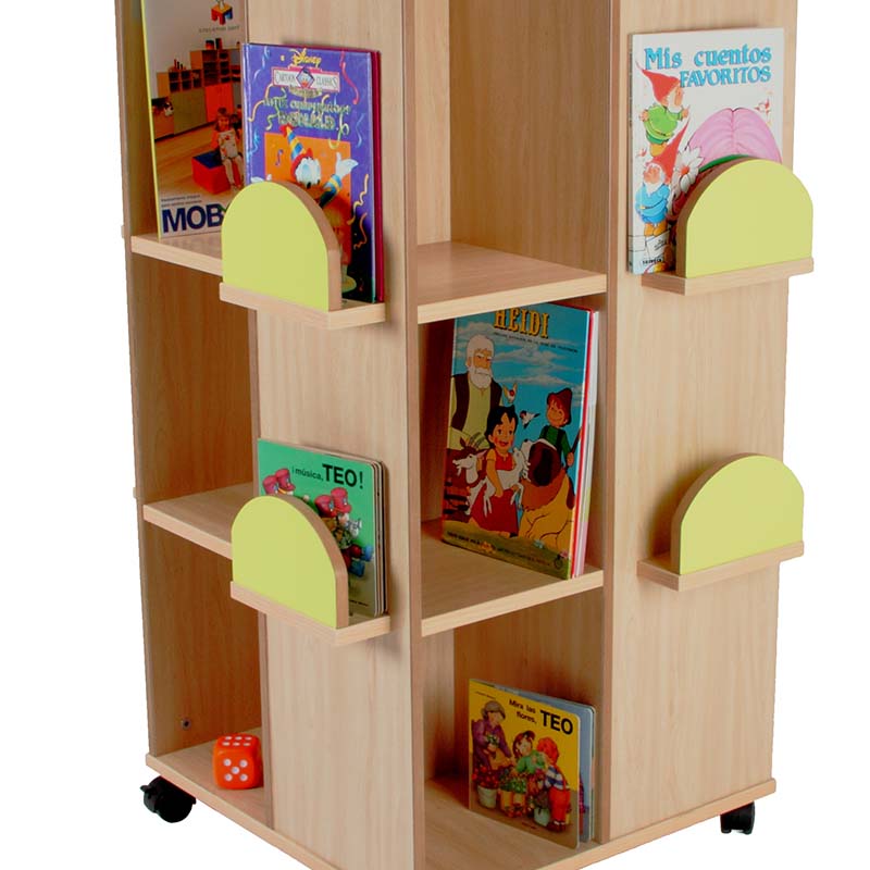Expositor de libros ovalado accesible por las dos caras, por una de las caras permite almacenar y exponer libros de frente, incluye una barra cilíndrica delante para impedir la caída de los mismos. Por la otra cara dispone de zona estantería donde poder almacenar todo tipo de elementos de lectura y una fila de cubetas en la parte baja que nos permite guardar cualquier material.