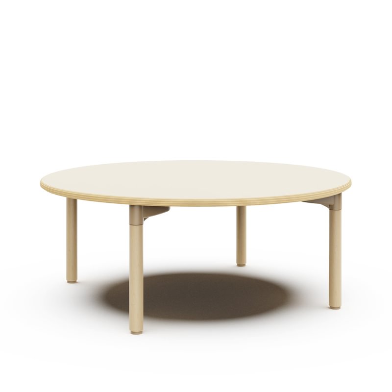 Mesa escolar infantil Yucca, de forma circular, fabricada en madera de abedul. Cuenta con un montaje fácil y sin tornillos. Su diseño es ideal para aulas y espacios educativos en escuelas infantiles.