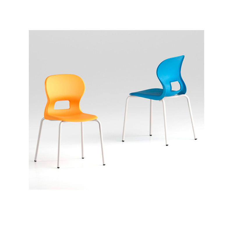 Este modelo de Silla escolar Ilse con respaldo curvado para un confort óptimo. Fabricada en polipropileno reciclado con estructura metálica de cuatro patas en color negro o gris. Incorpora un agujero en la parte trasera del respaldo, facilitando el orden en el aula.