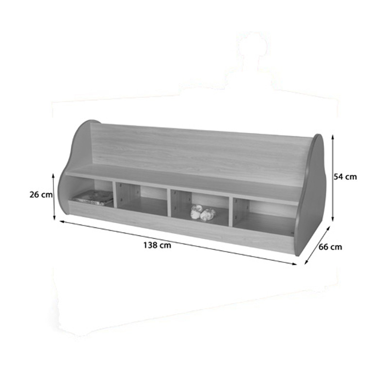 - Banco 8 plazas a dos caras con ocho casillas bajo el asiento para que los niños puedan guardar sus libros y juegos.