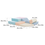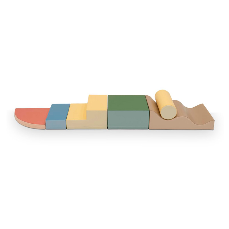 Set de bloques de espuma compuesto por 6 piezas versátiles: 1 escalera, 1 medialuna, 1 cuadrado, 1 rectángulo, 1 cilindro y 1 tobogán con ondulaciones.