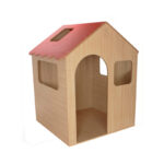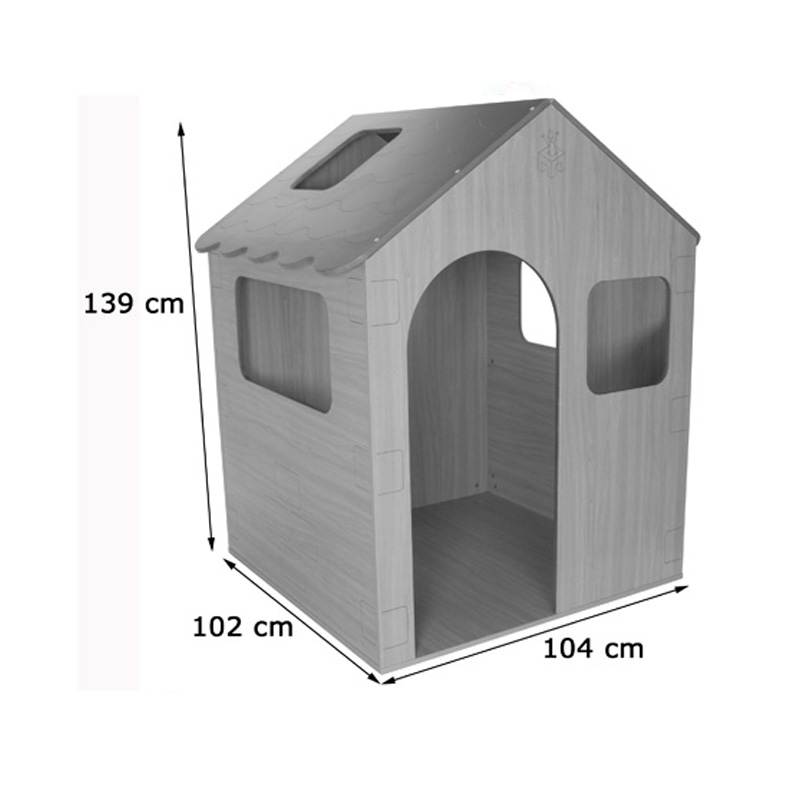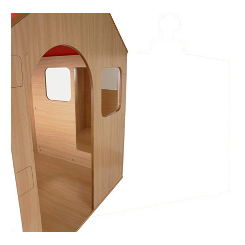 Casita de juegos con puerta y ventanas en todos sus lados, para facilitar la visión de las educadoras de todo el interior desde fuera de la misma; interior con espejo, ampliando las posibilidades de juego. Paredes y tejado decorados con ladrillos y simulación tejas, respectivamente.