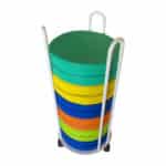 Carro + 12 puff ø30x5cm, carro metálico con ruedas para el transporte y almacenaje de 12 cojines de 30cm de diámetro x 5 cm realizados en espuma de poliuretano de 25 Kg, recubierta de PVC poliéster en colores diversos. El pack incluye el carro y los 12 cojines.