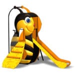 - Juego compacto con forma de abeja compuesto por un tobogán, por tubos en forma de patas formando una escalerilla, por rampa para acceder al juego, plataforma superior, casita en su interior con banco para sentarse y tubo deslizante en forma de antena.