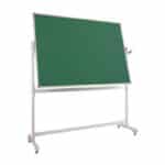 Pizarra giratoria laminada doble cara, con superficie de escritura verde para uso de tiza o blanca laminada para rotuladores de borrado en seco. Marco de aluminio anodizado plata mate y esquinas con cantoneras decorativas redondeadas de plástico. Soportes metálicos ovalados lacados en color gris, con ruedas y frenos, de alta calidad. Se suministran desmontadas.