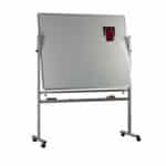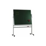 Pizarra giratoria vitrificada doble cara, con superficie de escritura blanca para rotuladores de borrado en seco e imanes o verde para uso de tiza e imanes. Marco de aluminio anodizado plata mate y esquinas con cantoneras decorativas redondeadas de plástico. Soportes metálicos ovalados lacados en color gris, con ruedas y frenos, de alta calidad. Se suministran desmontadas.