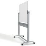 Pizarra blanca portátil de cristal sin marco con una espaciosa bandeja para rotuladores en la parte inferior que no entorpece la escritura. Dispone de ruedas para facilitar el desplazamiento entre salas de reuniones o zonas de descanso. La superficie de cristal blanco es magnética, muy fácil de borrar y especialmente resistente a las manchas de tinta, marcas de rotuladores, arañazos y abolladuras. Ideal para uso frecuente.