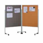 Tablero corcho tapizado móvil exposición. El tablero es siempre útil a dos caras y disponible en dos medidas cm (ancho x alto): 120×150 y 100×180 (ambos montaje únicamente en vertical). El montaje se realiza sin herramienta. Gracias al ángulo que forma la base del soporte, permiten juntar tantos tableros móviles como desee sin que se molesten y formando gran variedad de combinaciones según sus necesidades.