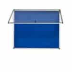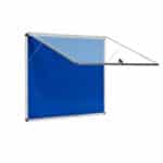 Vitrina convencional de aluminio con puerta elevable para uso interior con fondo de corcho tapizado azul.